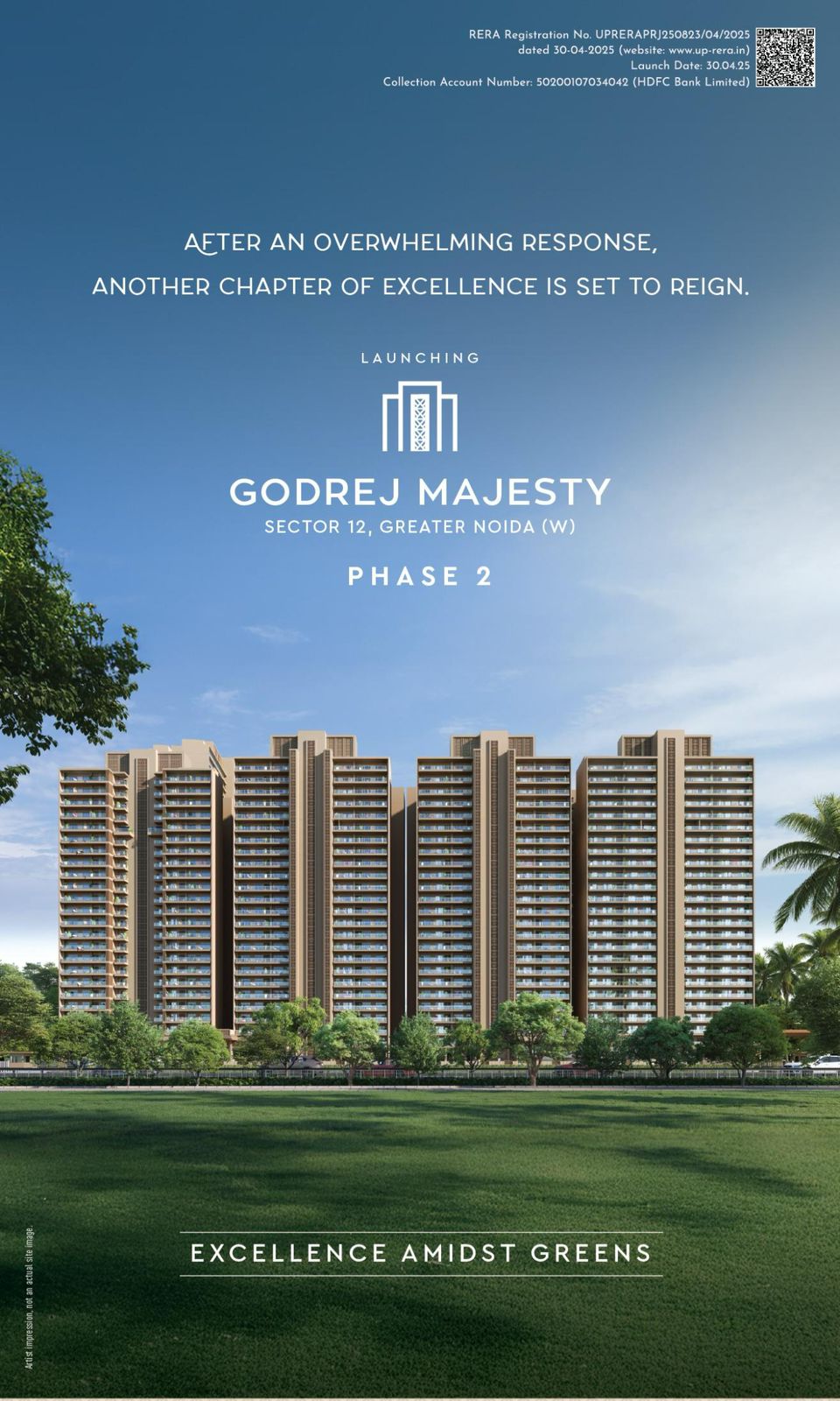 Godrej Majesty Greater Noida Project will be constructed on 8 acres of land parcel, 5 Towers with 1 Basement+Ground+2 Podium+23/34 floors having 3 BHK & 4BHK premium residences. Godrej Majesty Project is located Sector 12, Greater Noida West, Noida with - Greater Noida West Link Road - 400m, Numed Hospital - 3.1km, Milak Chowk - 3.9km. Godrej Majesty Noida Extension Sector 12 Project first is internal amenities - Vitrified Tiles, Granite Platform... SS sink & many more. Godrej Properties Greater Noida Sector 12 External Amenities Project has 35+ amenities with likes of - Swimming pool, Gymnasium, Clubhouse, Children Play Area, Senior Citizen Area & Many More. Majesty Sector 12 Noida Project has Two types of car Parking facility - Basement and Podium. Godrej Majesty Phase 2 Possession - Rera Possession - February 2030 and Target Possession - December 2029. Carpet Area & Floor Plan of Godrej Apartments Greater Noida project has 3BHK, 4BHK premium residences with - 3BHK - (1993 to 2368) sqft and 4BHK - (2575 to 2800) sqft. Godrej Majesty Sector 12 Noida Extension floor plan will have 3 flats 3 lift & 1 staircase on each floor. Godrej Properties Sector 12 Greater Noida West Prices & its details can be found in the price section & Godrej Majesty Sector 12 Noida brochure can be downloaded from the link mentioned below. Project has been praised by the home buyers & Godrej Properties Greater Noida West review is 4 out of 5 from over all the clients who have visited the site.